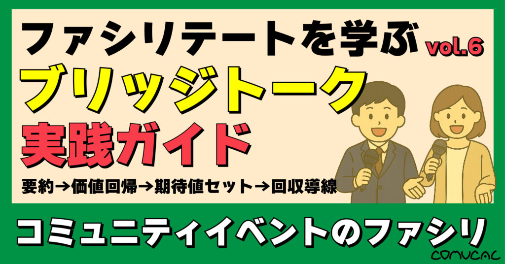 コミュニティイベントで“場の質”を左右することの1つが、登壇と登壇の合間に入るブリッジトーク。ここが弱いと、せっかくの学びや感情が素通りし、次のセッションにうまく接続されません。逆に、要約→価値回帰→期待値セット→回収導線の4点を丁寧に通すだけ... -